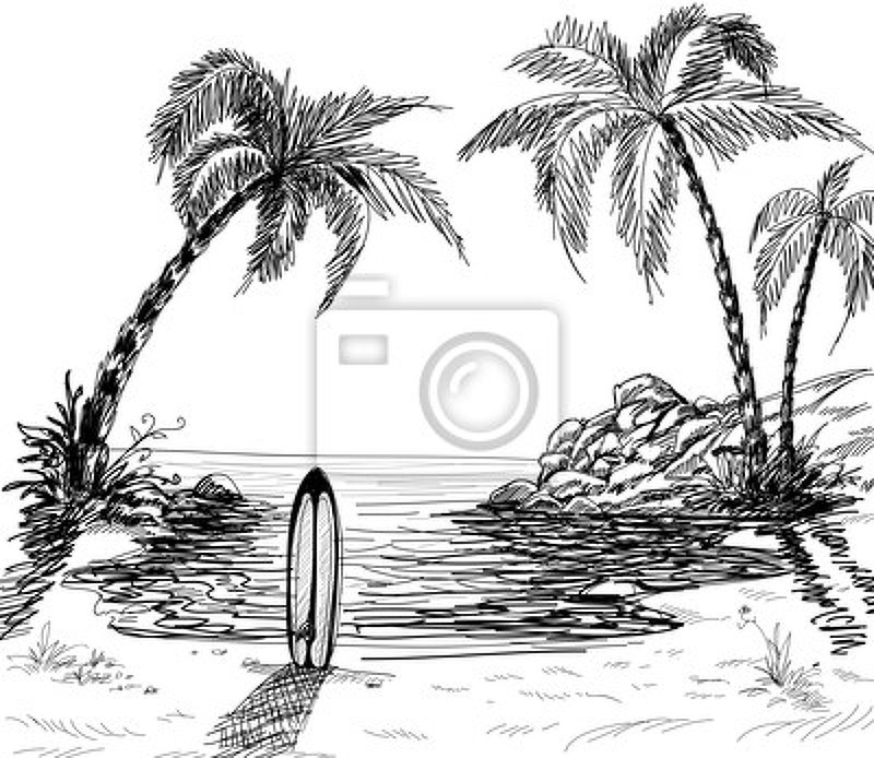 Арт-обои - Рисованный пляж с пальмами. Артикул 10003058.