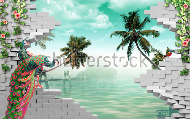 3д фотообои: стена, кирпич, пальма, павлины, море.... Артикул 10018029.