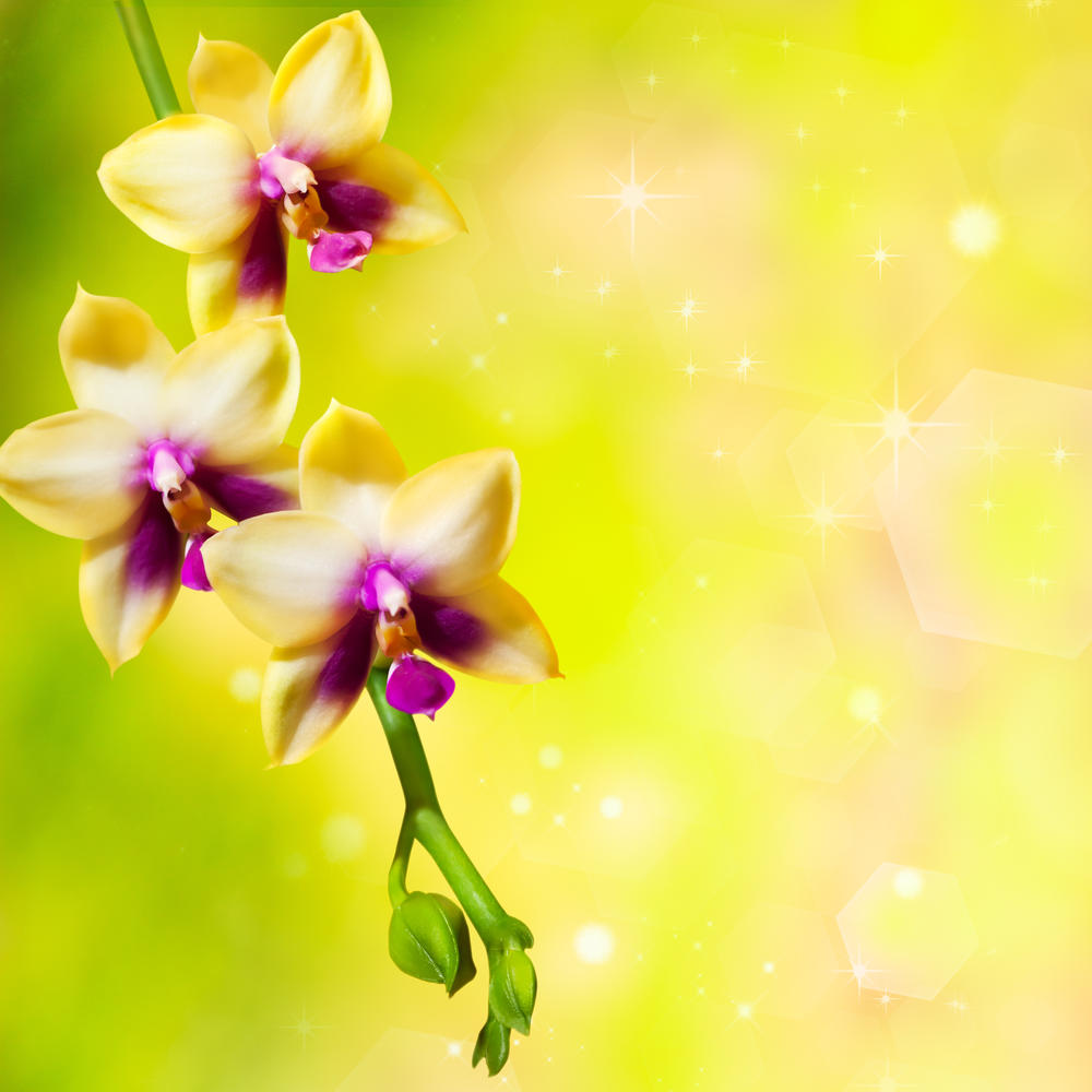 Арт-обои с орхидеями на желто-зеленом фоне. Артикул 10001995.