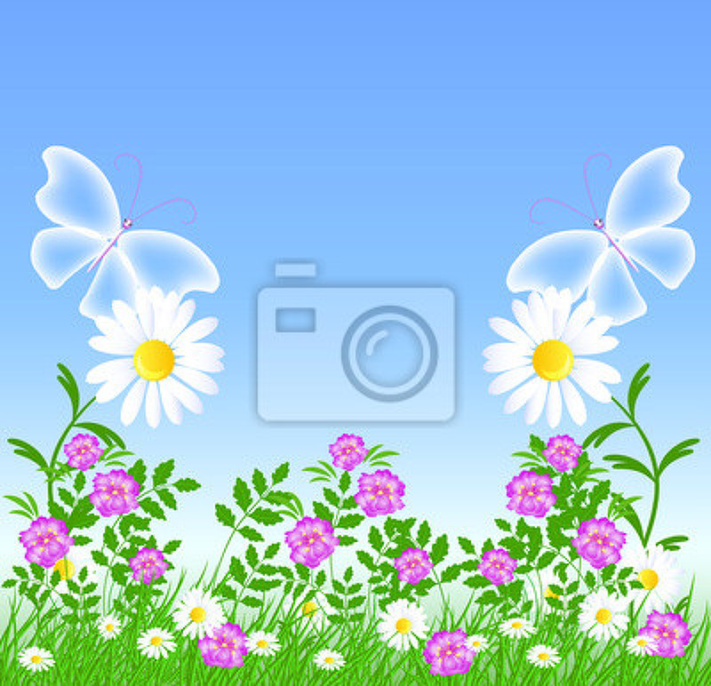 Фотообои - Рисунок ромашек с бабочками артикул 10004326