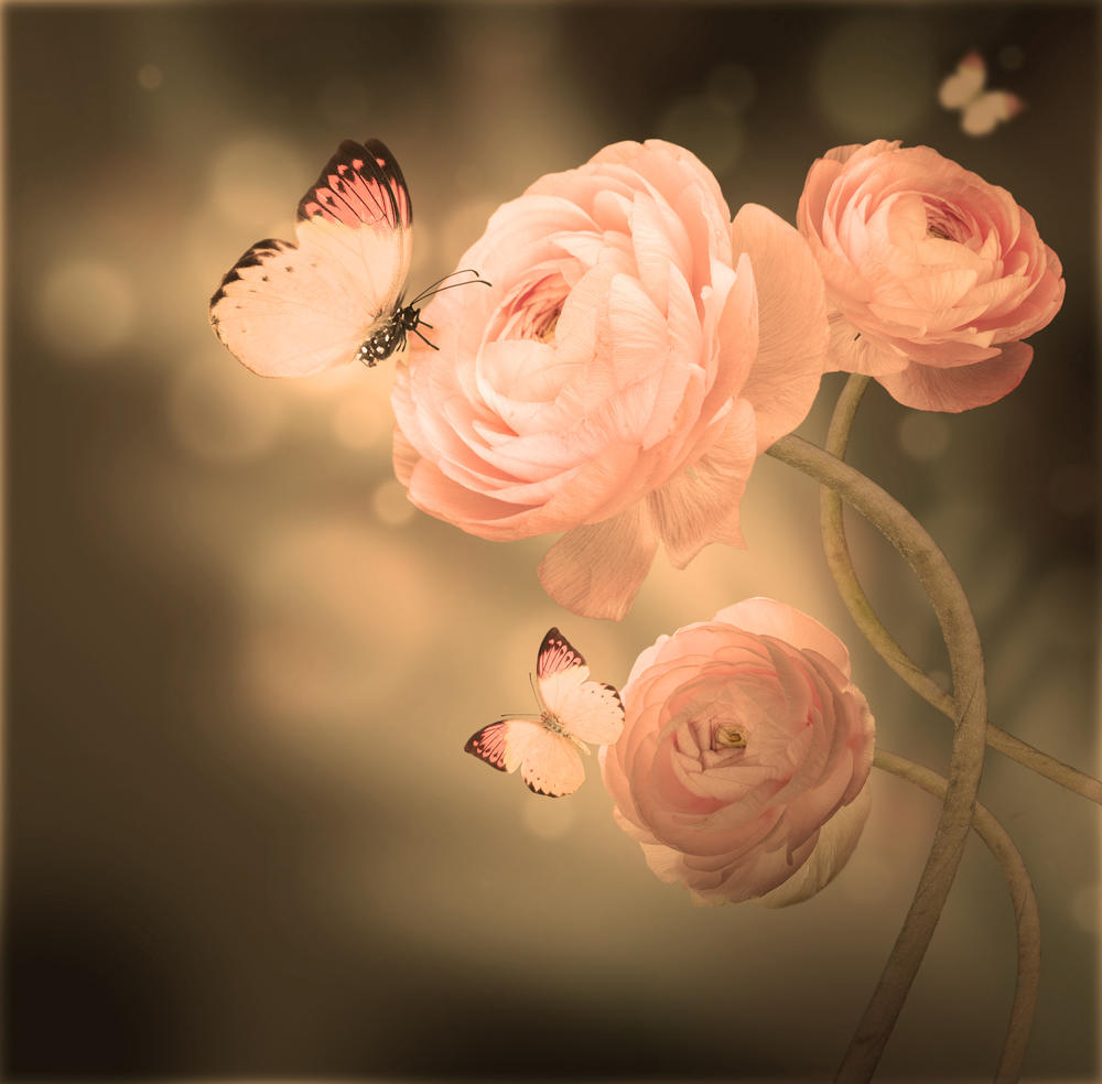 Фотообои - Розовые розы и бабочка артикул 10005856