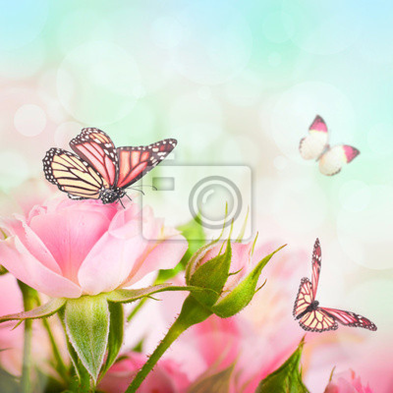 Фотообои на стену - Красивые розы с бабочками артикул 10005868