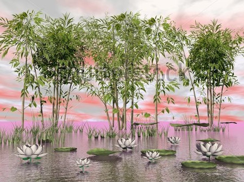 Фотообои 3Д с бамбуком и лилиями (креативный пейзаж). Артикул 10022236.