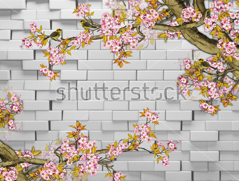 Обои с цветущими ветвями на фоне 3Д стены. Артикул 10021851.