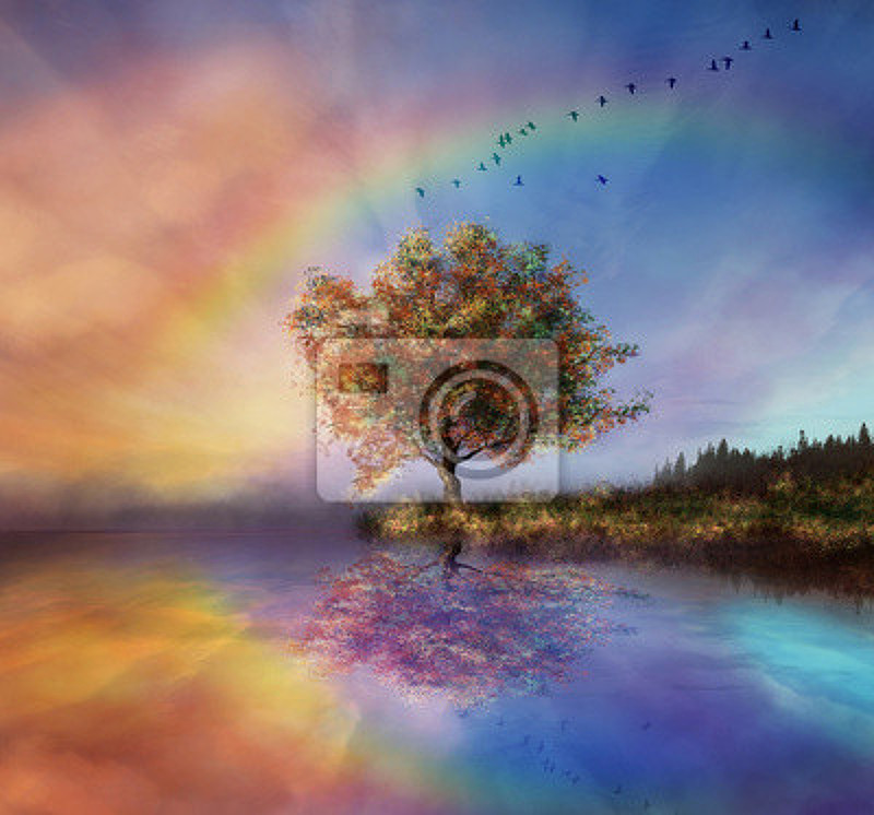 Фотообои - Пейзаж с радугой и деревом. Артикул 10007971.