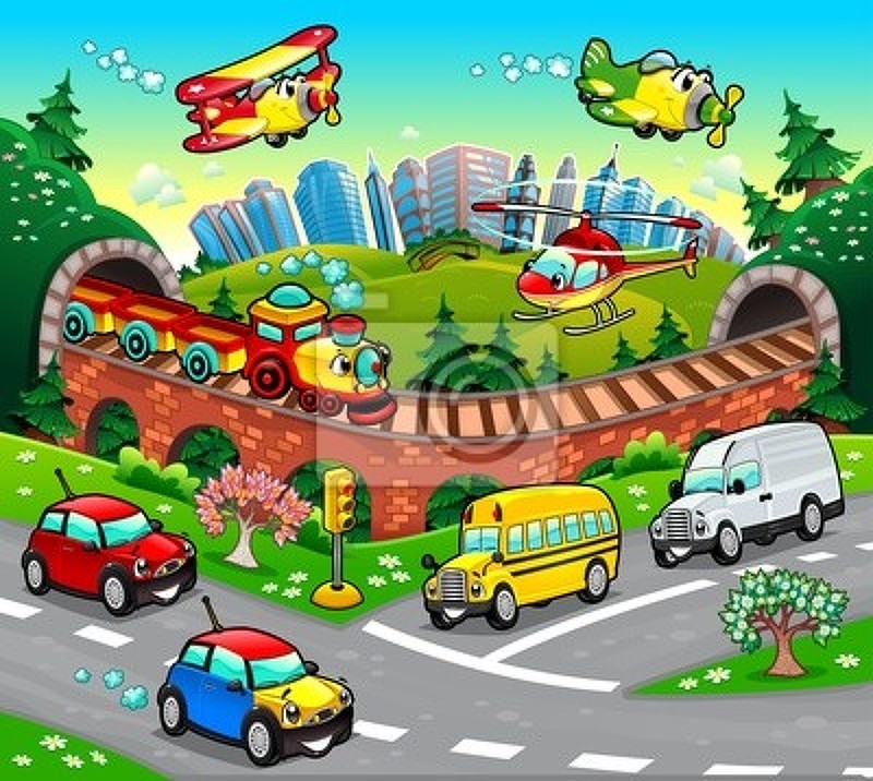 Фотообои - Мультяшный транспорт в городе. Артикул 10003544.