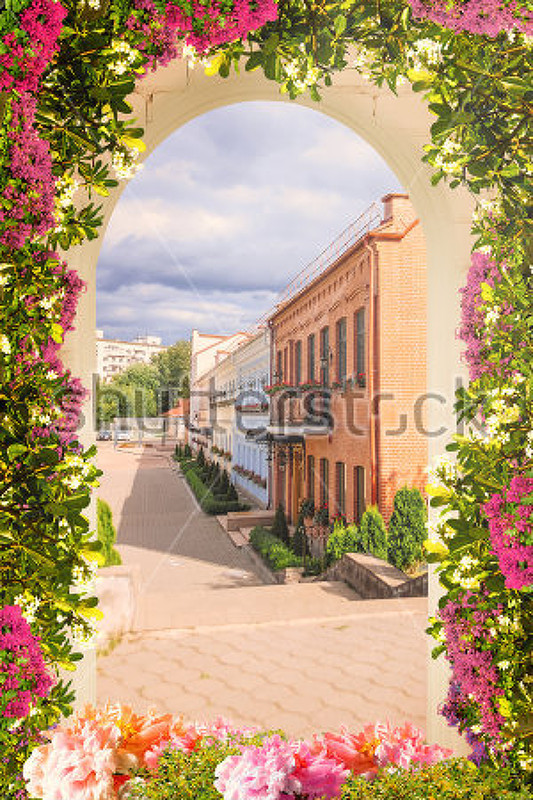 Цифровая фреска: античная арка и фон. Розовые цветы.. Артикул 10008359.
