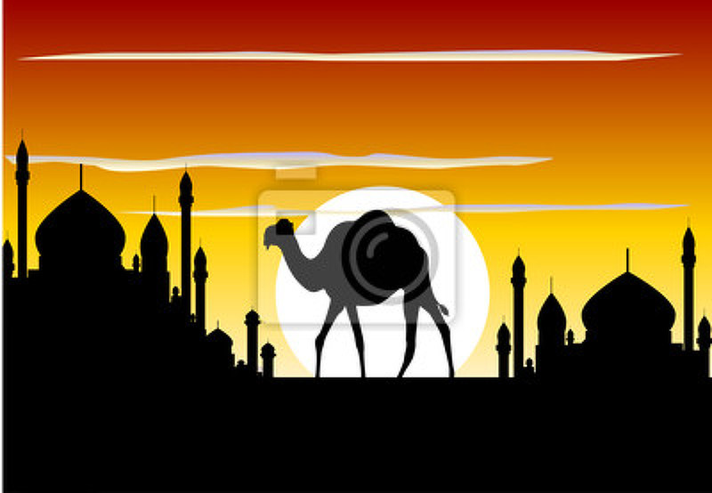 Фотообои - Верблюд на закате на фоне мечетей. Артикул 10003548.