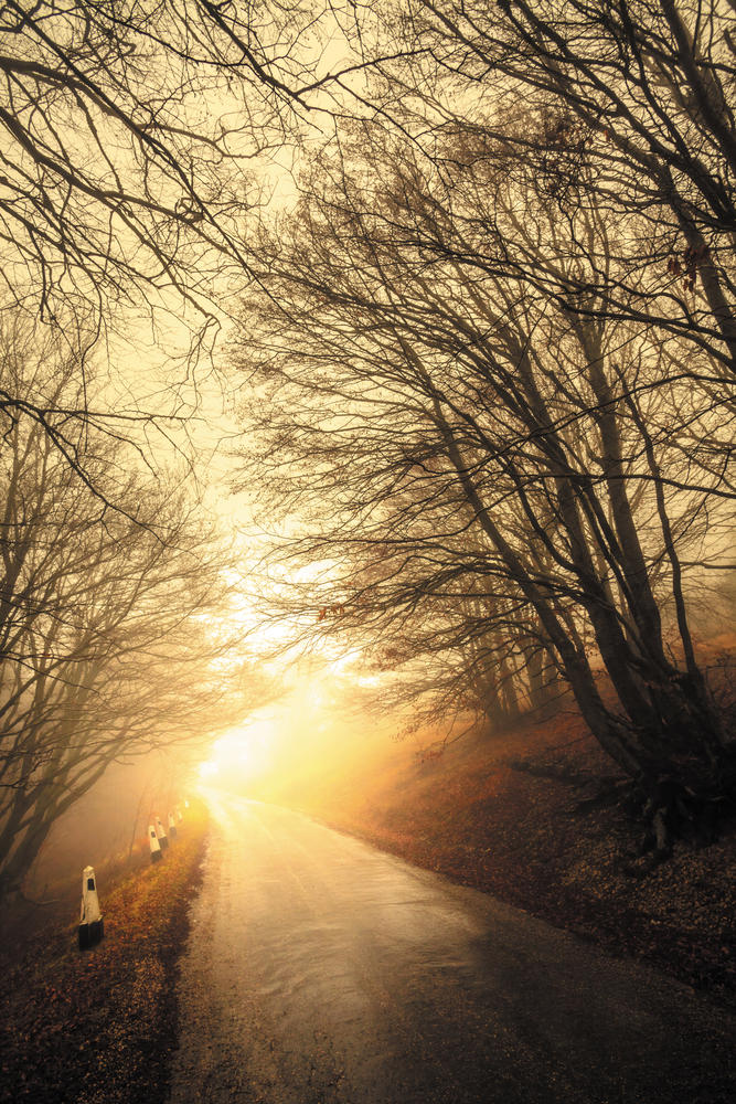 Обои с дорогой в туманном осеннем лесу. Артикул 10002301.
