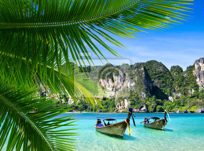 Фотообои с видом на лодки сквозь пальму артикул 10000089